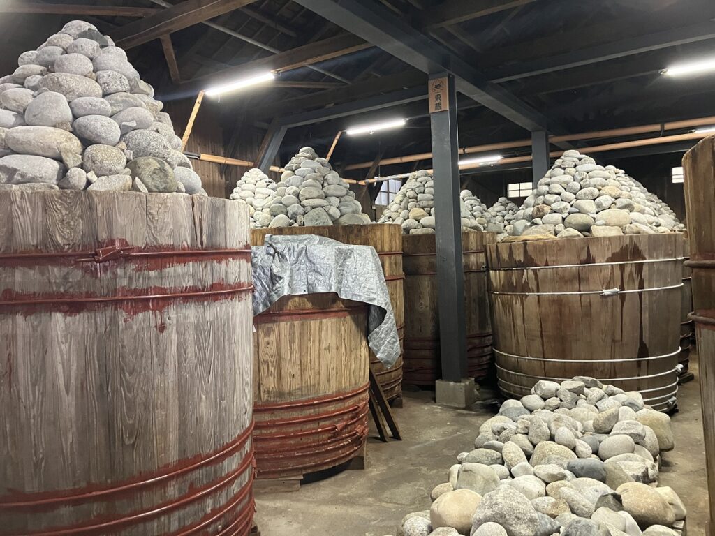 木桶に原材料を仕込み、天然石を重しとして、2年間以上自然熟成させて作られます。