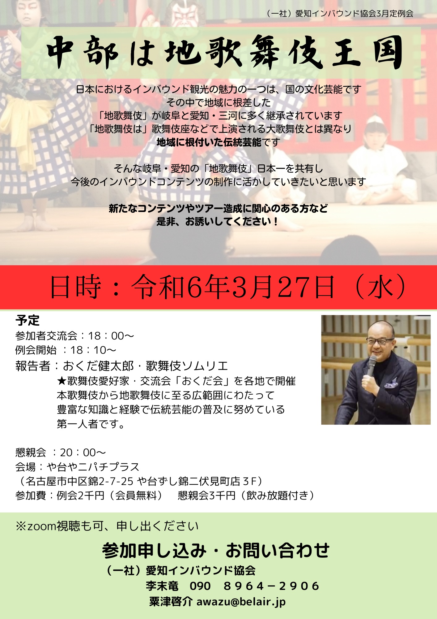 2024/3/27開催 中部は地歌舞伎王国 2024年3月18日 最終更新日時 : 2025年9月5日 wpmaster 「地歌舞伎」は岐阜と愛知、三河に多く継承されています。これは一般に知られる歌舞伎いわゆる大歌舞伎とは異なる、地域に根付いた伝統芸能なのです。 岐阜・愛知の「地歌舞伎」日本一を共有し、これからの愛知のインバウンドビジネスに活かすための参考となる定例会です。