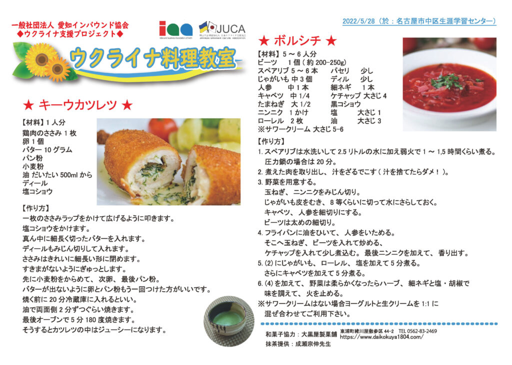 名古屋市中区の中生涯学習センターで、ウクライナからの避難民の方々を交えて、ウクライナ料理教室を開催しました。協会会員が18名、ウクライナ避難民が8名、在日のウクライナ人が2名、合計28名の参加と、テレビ局5局から15名、新聞社2社から2名の方々が取材に来られて、会場は大変盛況でした。