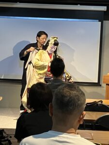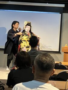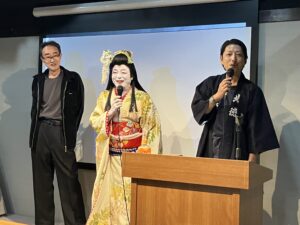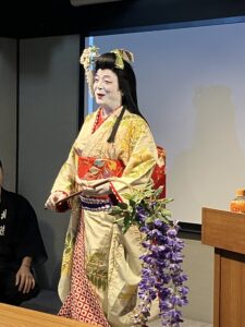 冒頭は女装した西川長秀師匠が華麗な日本舞踊と巧みな着物の技で、参加者を感動の渦に巻き込むところから始まりました。