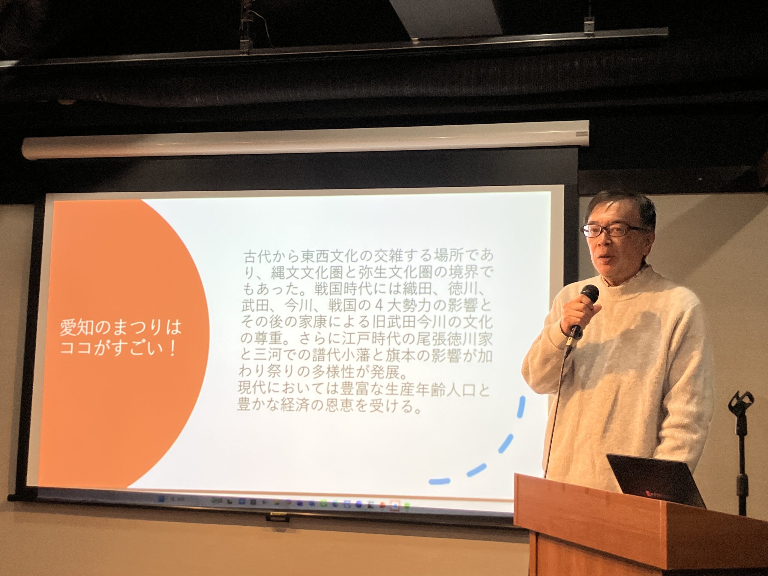 本定例会では日本神話に基づく伝説の由来を、祭り写真家のデン真さんが丁寧に解説してくれました。さらに、愛知県には日本神話によって行われている地域の祭りが、県内全域にわたっていることや、愛知と出雲の国の結びつきなどの説明もありました。