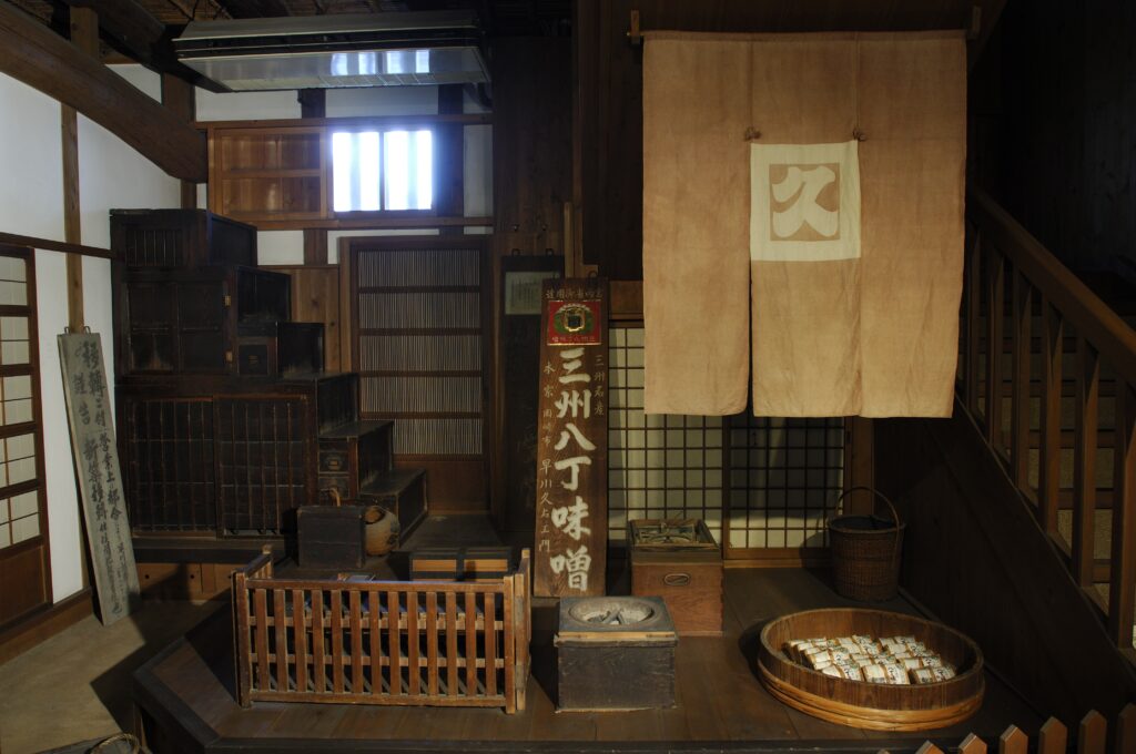 岡崎城から西方向に向かって八丁(約870m)の距離にある八丁村(現在の八丁町)に味噌蔵があります。ここでは当時将軍となっていた徳川家康が自身の健康のために考案した味噌のレシピに従って味噌が作られてきました。これが360年を経た今もそのまま引き継がれて、八丁味噌として伝統を伝える高級味噌となっています。この味噌蔵では、木桶に仕込まれた材料に石で重しを作り、二夏二冬の天然醸造で熟成している様子を見ることができます。
